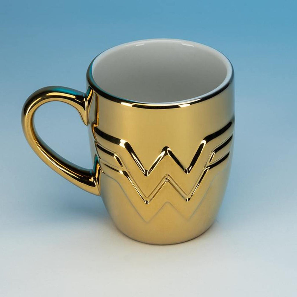 Celebrate the original female superhero with this oversized, electroplated golden finish mug. A great gift for all ages that can be used for both hot and cold drinks. The mug is embossed with the Wonder Woman logo from the 2020 movie Wonder Woman 1984. A great way for all wonder women in this universe to start their day.