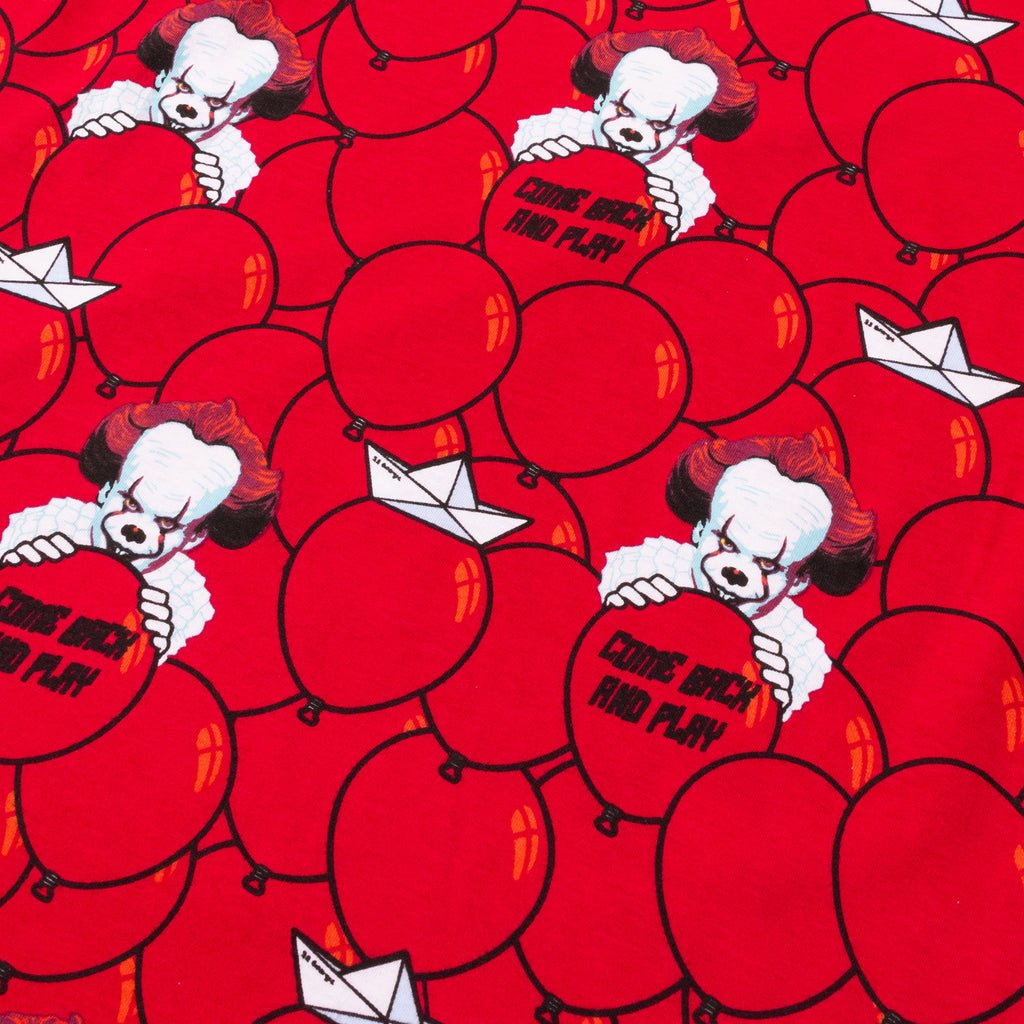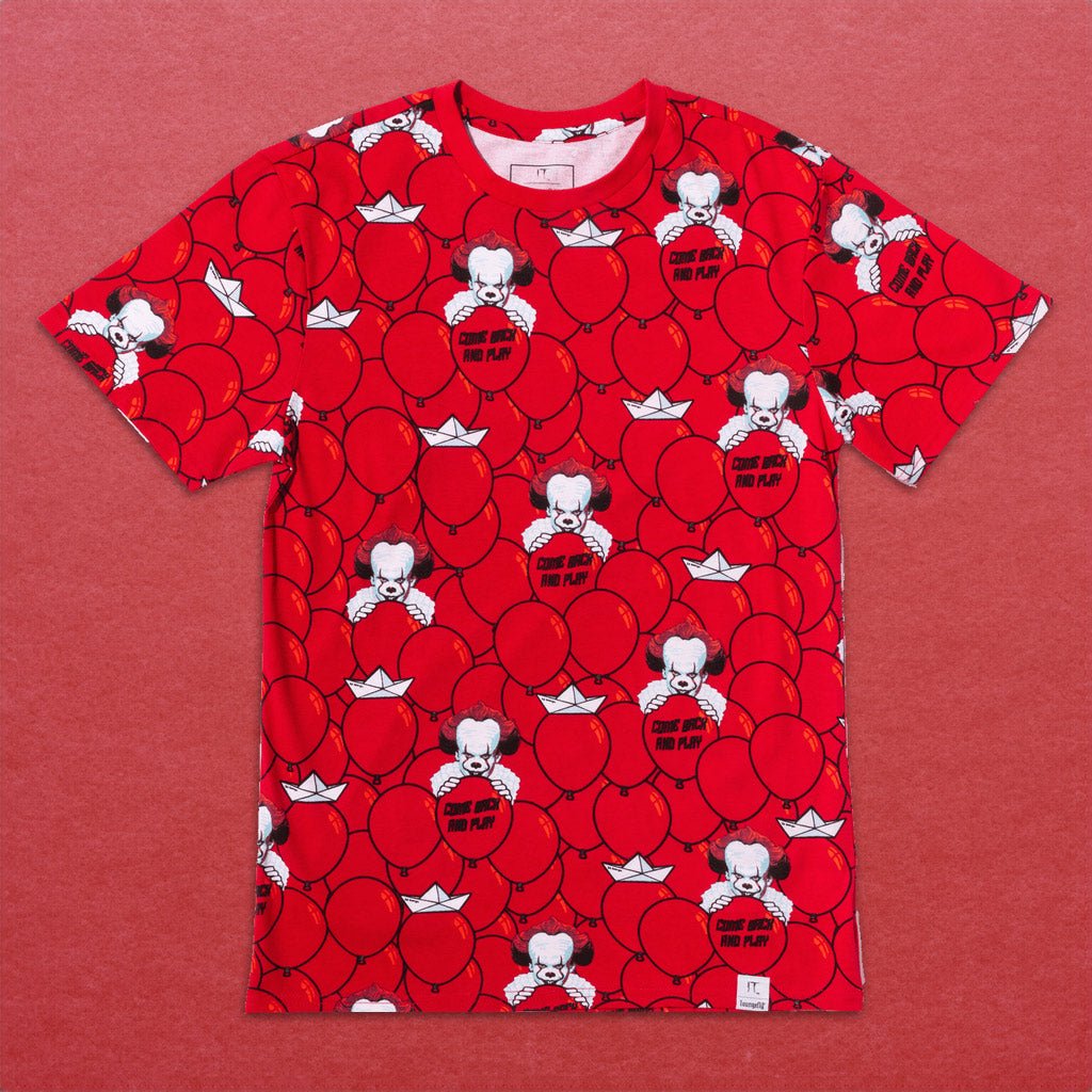 Floating the idea of making a wickedly fun entrance? Make it a reality with our IT tee shirt. This wickedly fun tee is ready for a jump scare with style. A brilliant motif of red balloons covers the fabric, and Pennywise makes an appearance behind a few red balloons that carry the message, “Come back and play.” Sail through your day looking frighteningly fashionable in this versatile and comfy tee.