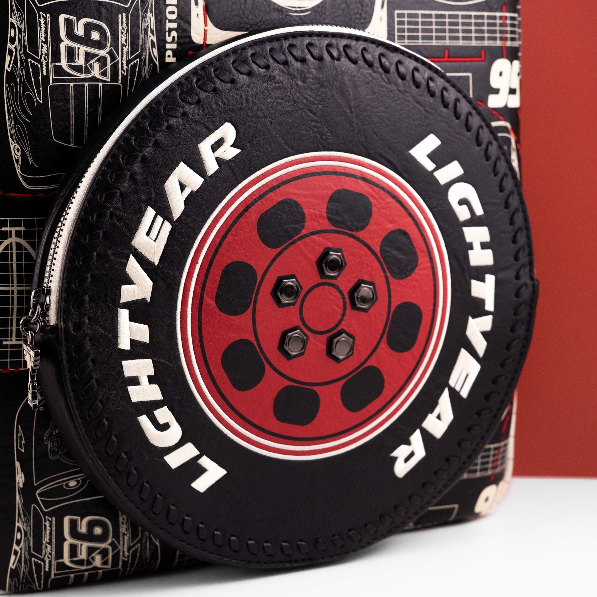 This full-size backpack features various images of Cars characters in white against a black background. The front pocket is shaped like a tire that says ""Lightyear"" on the side, and there are moulded metal rivets in the center! The straps are half-white, half-red, and feature an applique of the number ""95"".